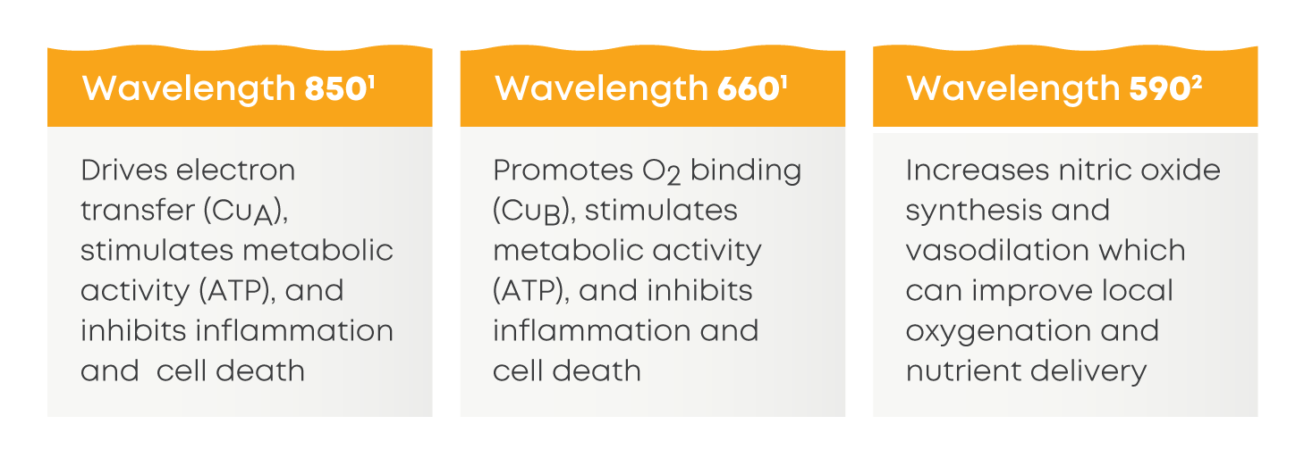 PBM MOA Support References: Begum, R. et al., PLOS One. 2013; 8(2):e57828; Fitzgerald, M. et al., Rev Neurosci. 2013; 24(2):205-226; Hamblin, M. Photochem Photobiol. 2018; 94(2): 199-212; Karu, T. et al., Lasers Surg Med. 2005; 36(4):307-314; Karu, T. Photochem Photobiol. 2008; 84(5):1091-1099; Wong-Riley, M.T.T et al., J Biol Chem. 2005; 280(6):4761-4771.